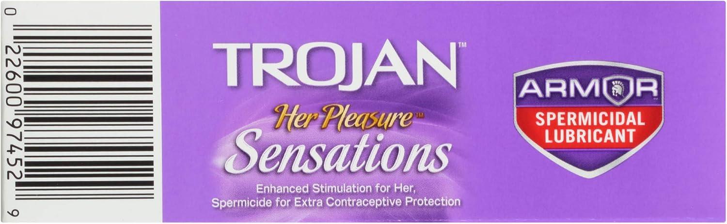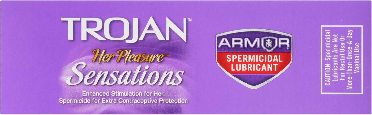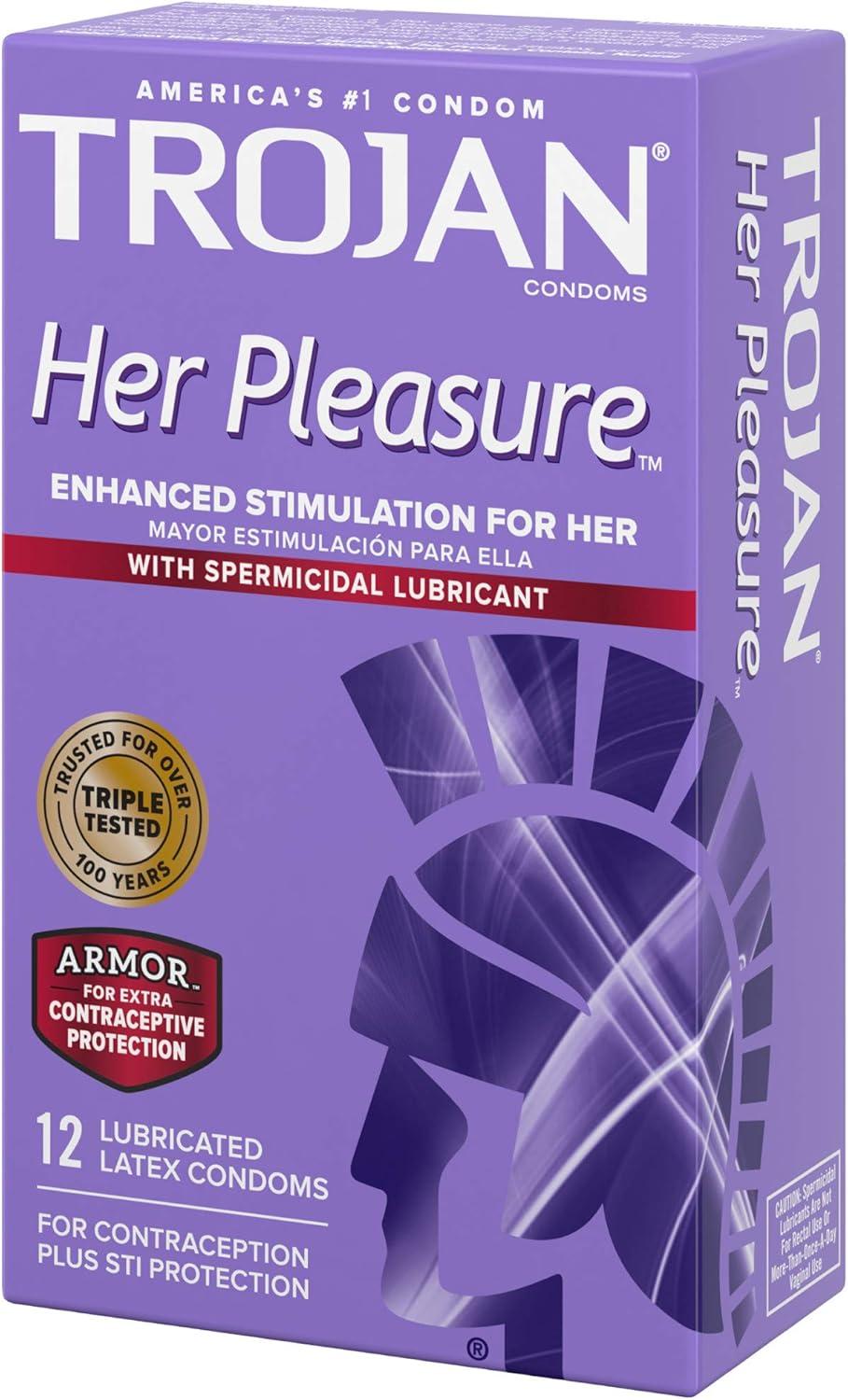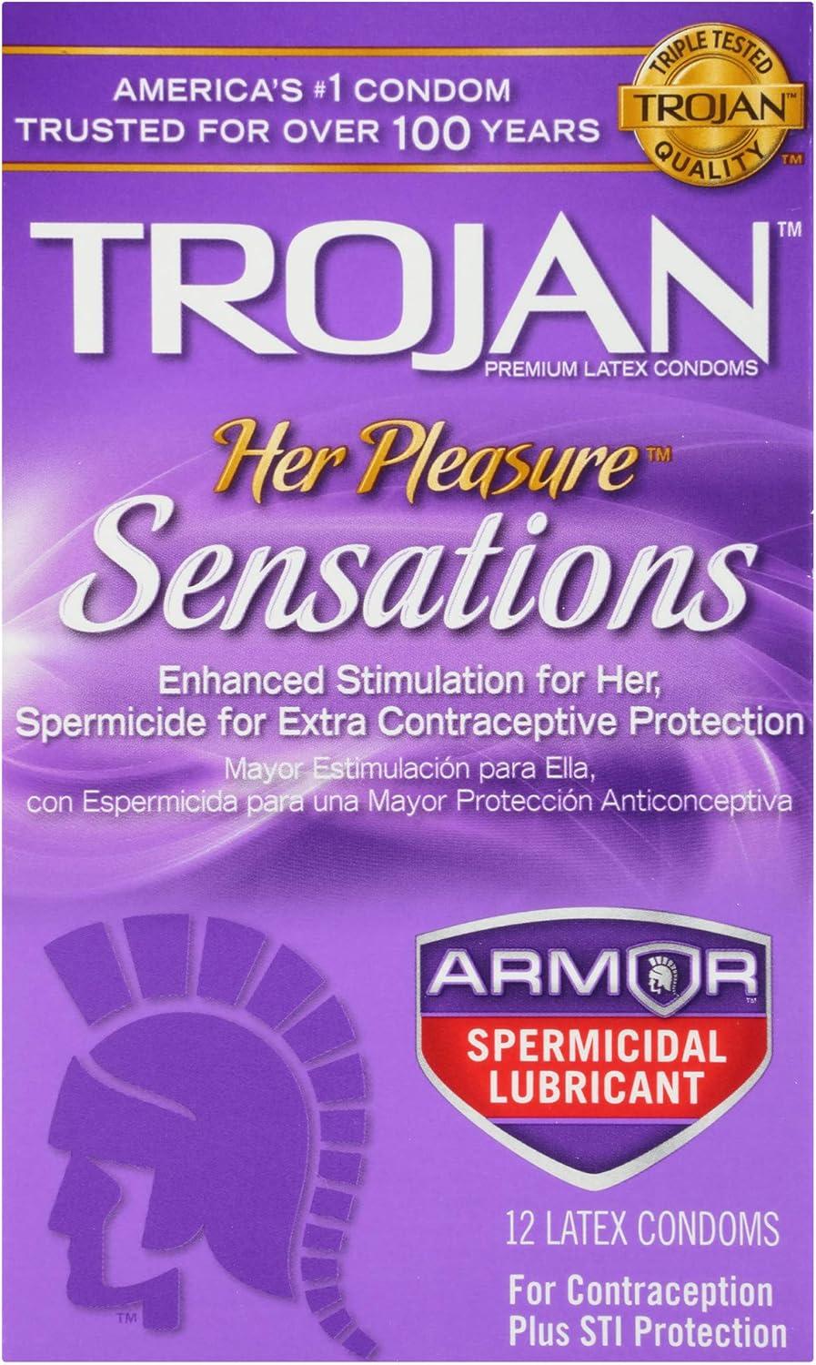 TROJAN Her Pleasure Sensations Condoms, Ribbed Condoms, Spermicidal Lubricated Condoms, 12 ct have a unique design — ribbed and contoured for extra enjoyment and stimulation. Nonoxynol-9 Spermicide is on this condom for extra protection against pregnancy ONLY — NOT for extra protection against HIV and other STIs. TROJAN Brand condoms are America's #1 condom, trusted for over 100 years. The TROJAN Brand promotes a safe, healthy and fun sex life. From condoms to vibrators to lubricants, TROJAN Brand is dedicated to delivering innovative, high-quality products that offer protection and peace of mind.