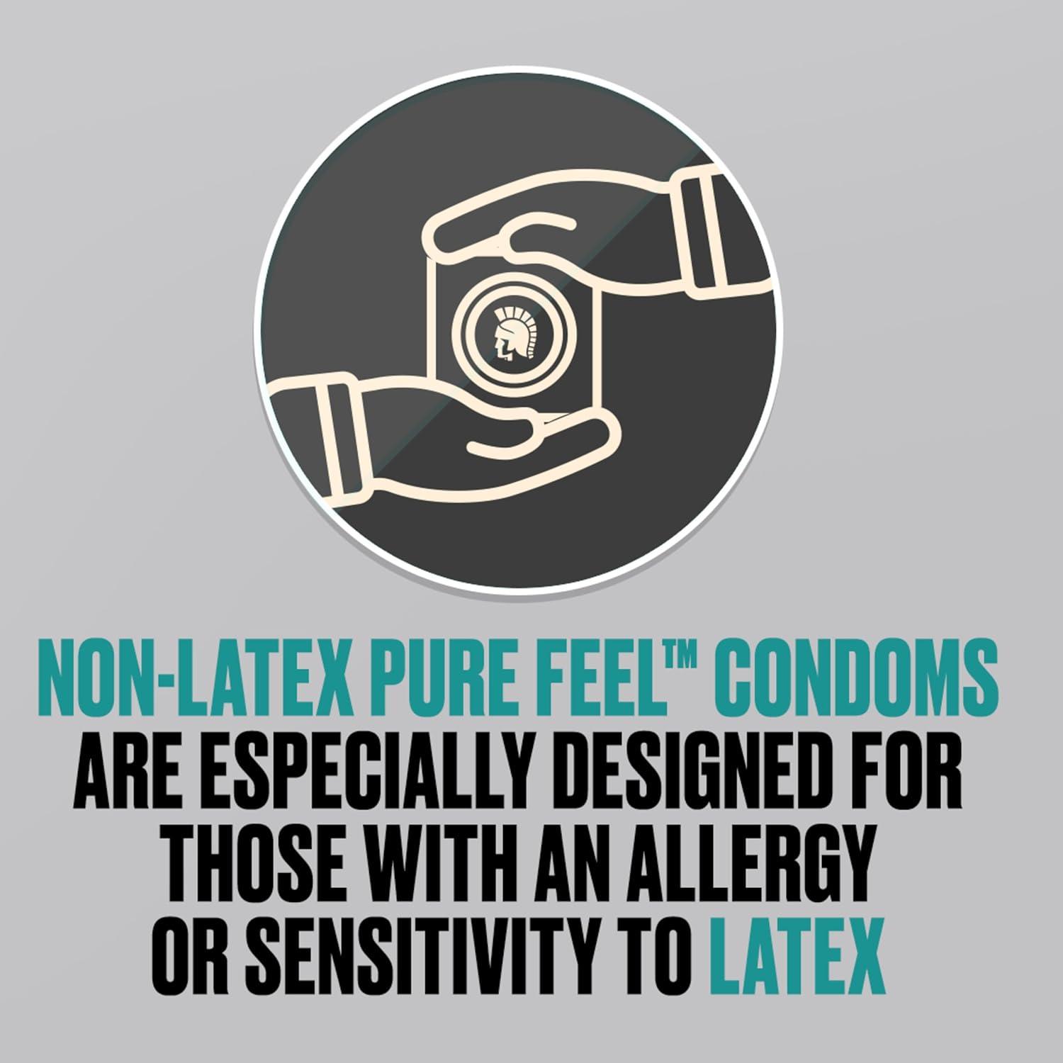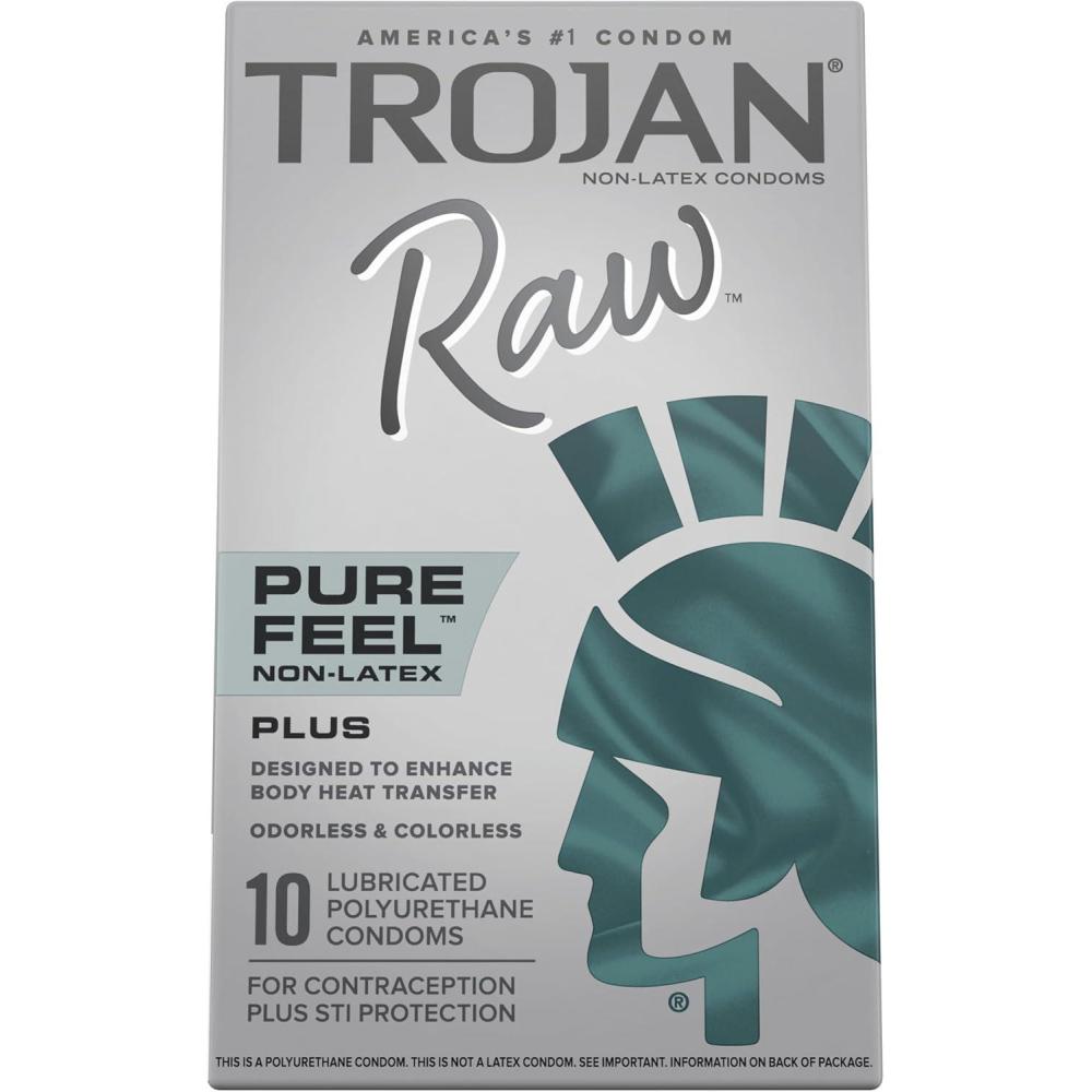 Trojan Raw Non-Latex condoms are ultra-thin polyurethane condoms for ultimate sensual pleasure. Trojan Raw Non-Latex condoms are America's thinnest condom*, made with Pure Feel Non-Latex that is odorless, colorless and designed to enhance body heat transfer. Trojan Raw Non-Latex condoms include a silky smooth lubricant to increase comfort and sensitivity. Electronically tested to help ensure reliability. For extra safety, there is a special reservoir end. Tapered at the base for a secure fit. FOR LATEX SENSITIVE CONDOM USERS. Use these condoms if you or your partner are allergic to latex. Trojan Raw Non-Latex brand condoms are intended to prevent pregnancy, HIV/AIDS, and other sexually transmitted infections. Trojan Raw Non-Latex brand condoms reduce the risk of transmitting STIs by providing a barrier against the source of the infection. However, they do not completely eliminate the risks of pregnancy and STIs. For additional information on condoms, STI and pregnancy protection, or if you believe you have an STI, contact a health care provider or public health agency.